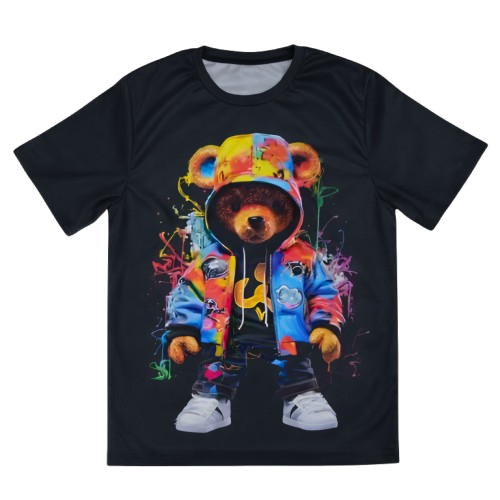 Turn heads with this bold streetwear statement tee. Featuring a striking teddy bear graphic dressed in vibrant urban gear, this T-shirt blends playful character art with gritty street style. The high-definition print pops against the deep black fabric, delivering standout visuals that won’t fade.